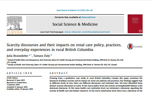 Drawing from a qualitative case study in rural British Columbia, Canada, this paper examines the discourse of kidney scarcity and its impact on renal care policies and practices. Our findings suggest that at different levels of care, there are different discourses and treatment foci. We have identified three distinct scarcity discourses at work. At the macro policy level, the scarcity of transplantable kidneys is the dominant discourse. At the meso health care institution level, we witnessed a discourse regarding the scarcity of health care and human resources. At the micro community level, there was a discourse of the scarcity of health and life-sustaining resources. For each form of scarcity, particular responses are encouraged. At the macro level, renal care and transplant organizations emphasize the benefits of kidney transplantation and procuring more donors. At the meso level, participants from the regional health care system increasingly encourage home hemodialysis and patient-led care. At the micro level, community health care professionals push for rural renal patients to attend dialysis and maintain their care plans. This work contributes to critical, interdisciplinary organ transfer discourse by contextualizing kidney scarcity. It reveals the tension between these discourses and the implications of pursuing kidney donations without addressing the conditions in which individuals experience kidney failure.